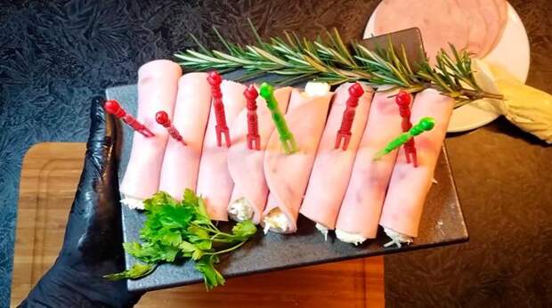 Для простых рулетов лучше взять готовую нарезку из ветчины, но подойдет любая. В центр каждого ломтика выкладываем готовую начинку и плотно сворачиваем в рулет. Чтобы закуска не теряла форму, ее можно зафиксировать зубочисткой или шпажкой.