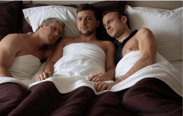 На изображении политики представлены в откровенном и компрометирующем виде – трое мужчин возлежат вместе на кровати*. Отмечается, что глава Незалежной выглядит весьма растеряно.