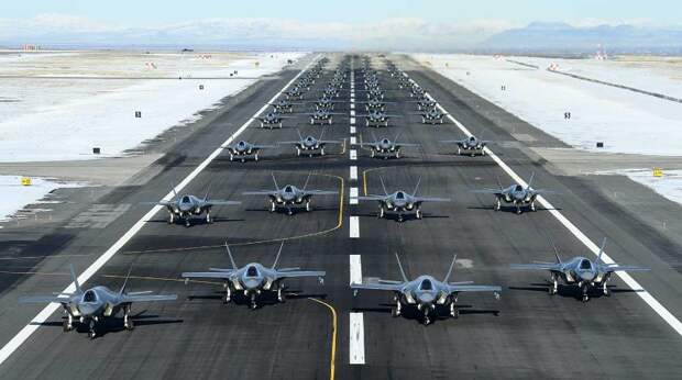 Боевая авиация Военно-воздушных сил США на военной базе Эилсон на Аляске провела так называемую слоновью прогулку на фоне того, как русские разминают свои мускулы в этом регионе. Флот из 30 истребителей и двух заправщиков выстроился на взлетно-посадочной полосе авиабазы, демонстрируя воздушную и военную мощь Америки.
