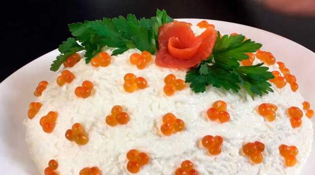 Осталось только украсить. Для этого можно использовать красную рыбу, икру, петрушку – все, на что хватит фантазии. Новогодний салат "Принцесса Норвегии" готов – можно подавать к столу.